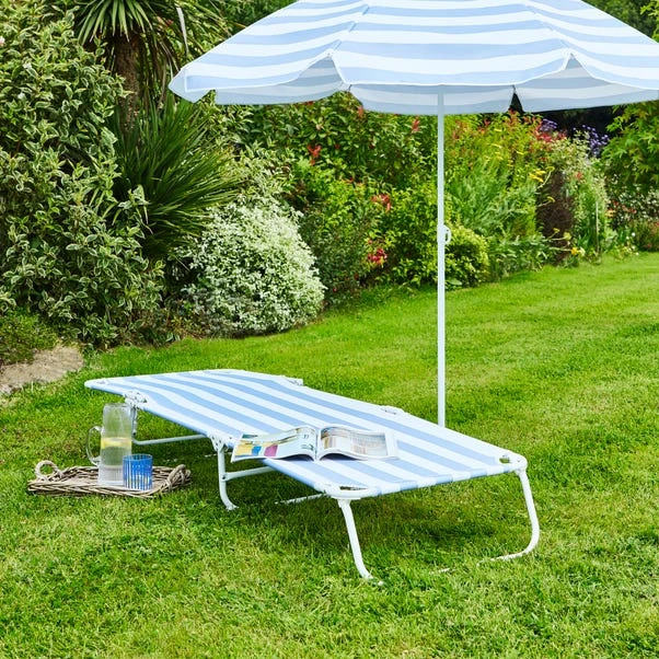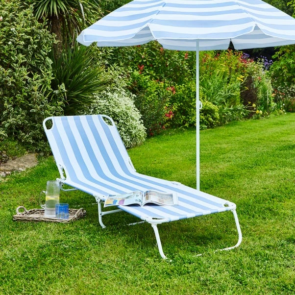 Relax in style with this blue and white folding lounger, perfect for the beach, picnics, or simply lounging in the garden. The vibrant blue stripe design adds a cheerful touch to any outdoor setting. Its foldable design makes it easy to store away when you’re not using it, saving you space and hassle. Lightweight yet sturdy, this lounger offers the ideal blend of comfort and practicality. Whether you’re soaking up the sun or unwinding after a busy day, it’s the perfect way to kick back and relax. Brighten up your outdoor moments with this easy-to-use, colourful lounger.