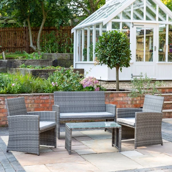 Perfect for relaxing and enjoying the Summer sun in style, this Cancun Conversation Set is stylish and comfortable. With a unique rattan design, this set includes cushions for added comfort. This set is crafted from steel, glass, and rattan, making it durable and low maintenance.