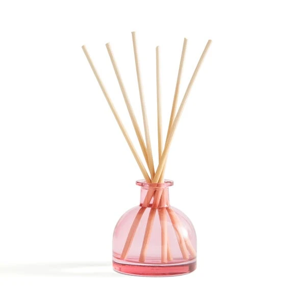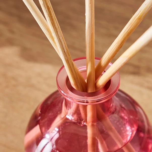 Bring a burst of colour and fragrance to any room with this pink glass diffuser. The delicate tropical blend of dragonfruit and blossom melds perfectly with heart notes of rose-blushed lychee, sweet cassis, and candyfloss. The sweet, creamy amber undertones create a warm, inviting atmosphere, and with six natural rattan reeds, it ensures a long-lasting scent experience for up to 10 weeks. Perfect for refreshing any corner of your home.