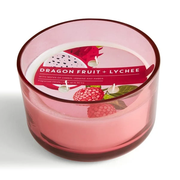 Create a warm, inviting atmosphere with this luxurious multi wick pink glass candle. The tropical blend of rose-blushed lychee, sweet cassis and exotic dragonfruit is perfectly complemented by candyfloss accords and creamy amber, making it a treat for the senses. With three wicks for an even burn, it adds a touch of elegance and colour to any room. With a 30 hour burn time, this is a beautifully fragrant, long-lasting addition to your home.