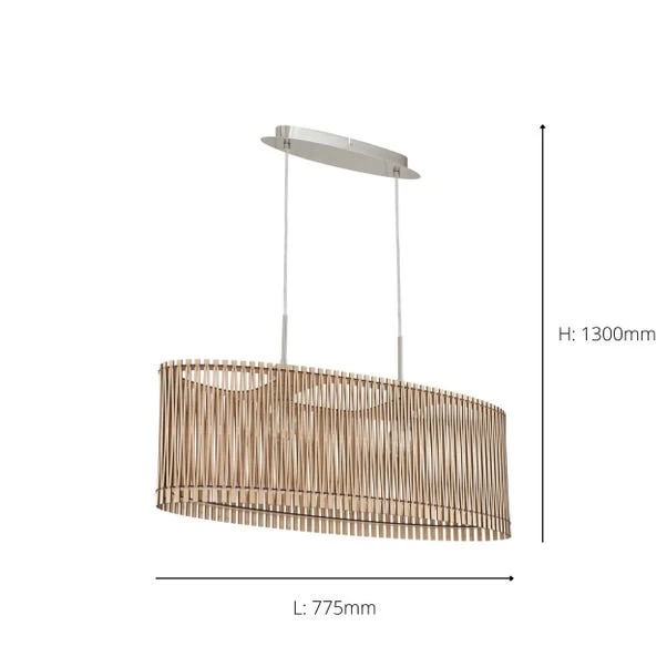 The Sendero pendant light has an oval lampshade made from maple wood slats suspended from a matte nickel metal canopy. The wooden slats create a fascinating play of light and shadow when the light is on. The pendant light blends seamlessly with modern interior design styles and provides cosy lighting in the living room or above the table in the dining room.