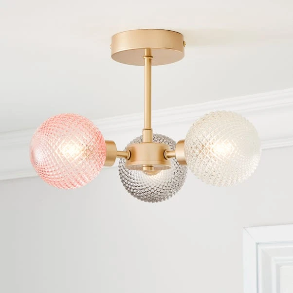 Perfect for adding a luxurious touch to your home décor, this stunning Elodie 3 Light Ceiling Fitting is stylishly crafted with a gold painted finish metal frame and is detailed with faceted round glass shades. The semi-flush design makes it perfect for any home, specially homes with low ceilings and the dimmable feature will help to create the perfect ambience for any occasion. This ceiling fitting is available in three stunning colourways to suit any home interior.