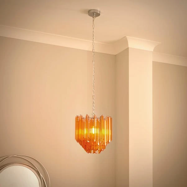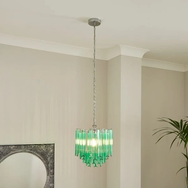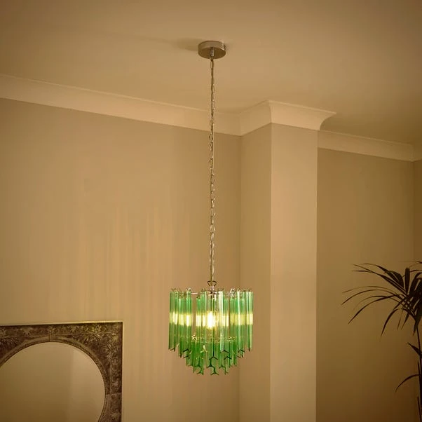 Introduce a touch of modern sophistication to your home with our Esme deep green chandelier. This piece really packs a punch. With a rich green colour, carefully held by a chrome frame, this light will take centre stage in your room. Ideal for a living room or dining room piece, the staggered acrylic pieces create a full look, with the light bouncing off the faceted edges when lit. It will provide a contemporary feel for any living space. Other colours and family items are also available.