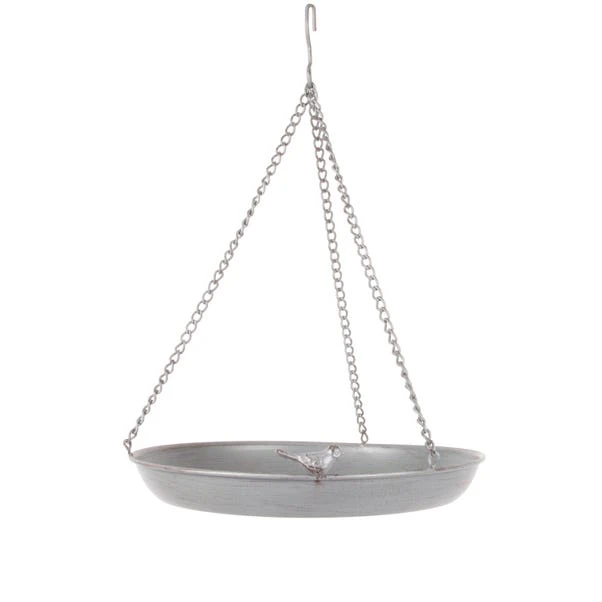 The Grey Metal Hanging Bird Bath ensures birds have a safe drinking space in your garden. With its decorative design and included chain, this grey metal saucer can be suspended near a window or terrace, making it convenient to watch birds bathing and feeding.