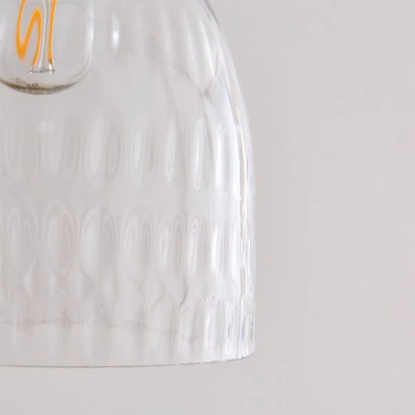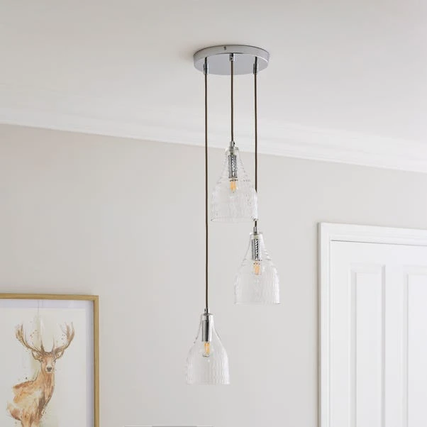 Crafted with attention to detail, the elongated dimple effect glass shades of this pendant light exude a sense of modernity and style. The subtle curves and elongated shape of the glass shades further enhance the overall aesthetic appeal of this fixture. The chrome ceiling plate beautifully complements the glass shades, creating a striking contrast that catches the eye. The adjustable height cable provides flexibility in installation, enabling you to customise the pendant’s position according to your preferences. Whether you want to create a dramatic effect by hanging it low over a dining table or adjust the height to fit the proportions of your room, this feature ensures a seamless integration into your existing decor.