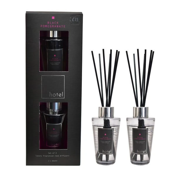 This diffuser set has a dark and opulent pomegranate scent sparkling with juicy red fruit, pink pepper and fig, finished with a rich blend of cedarwood, musk and silky vanilla.. Included in this set are two 80ml diffusers. Each vessel comes in a translucent black vessel with a matte silver effect trim and will last up to 7 weeks each.