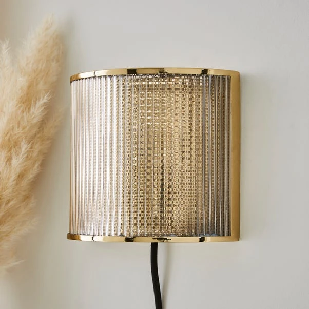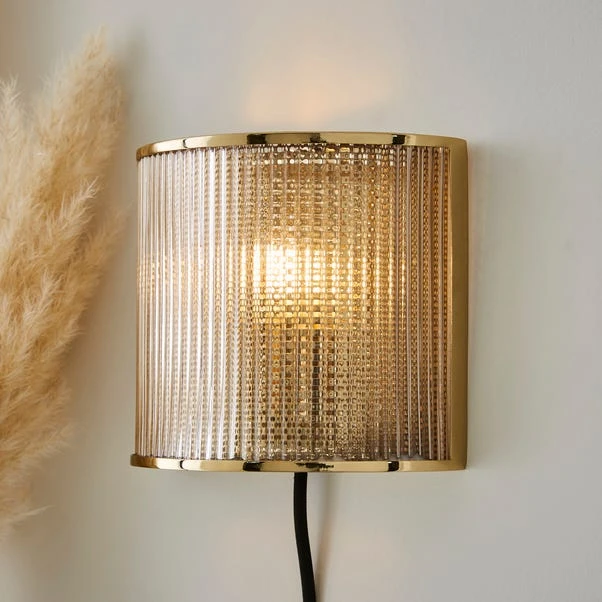 Enhance your decor with the Kruze Wall Light, featuring a textured glass finish and a curved shape that adds a touch of sophistication. This wall light can be powered by a standard plug in socket.. Available in another luxe colour, it offers versatility to match your existing aesthetic.