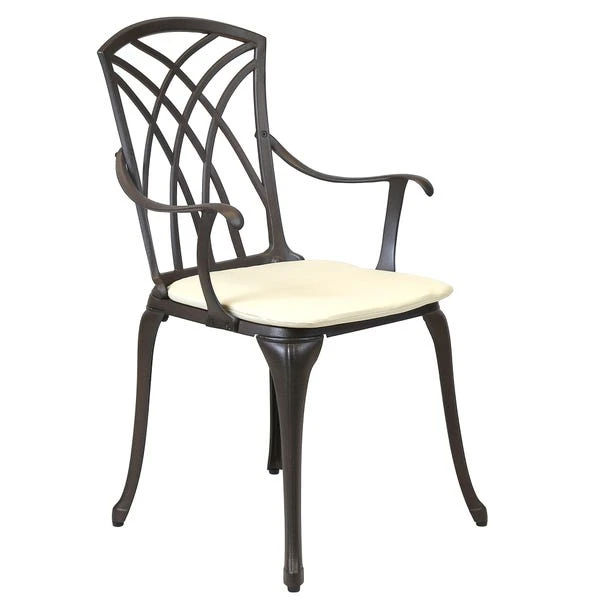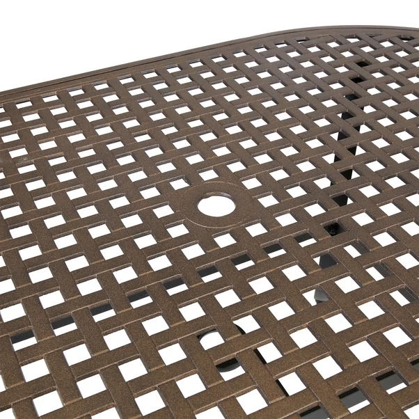 This classic and stylish oval dining set is the perfect addition to any garden. Ideal for al fresco dining this set is weatherproof and its bronze finish means this set would look beautiful in any garden. This table has a central hole for placing a parasol.