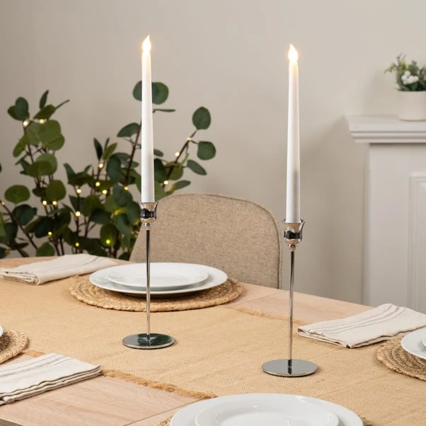 This set of 2 candlestick holders are an elegant and sophisticated finishing touch for your table. Suitable for taper candles (not included), they will instantly bring class and height to your table display with their simple, slim design in gloss silver finish. Alternatively, place on a sideboard for an additional source of light.