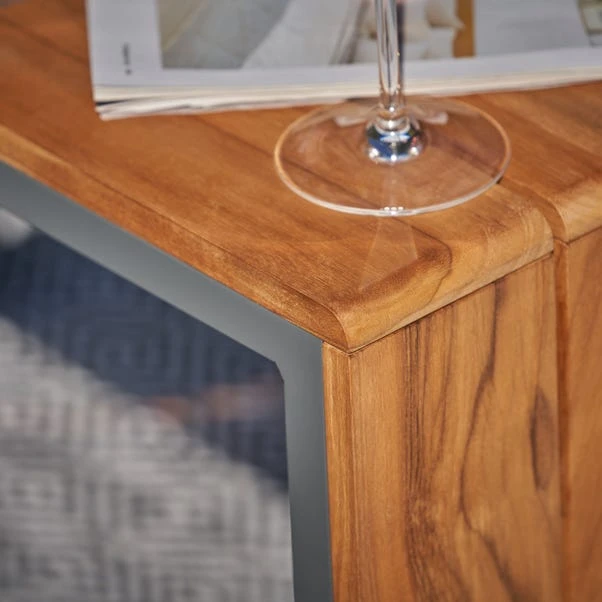 The Stockholm Corner Set with Fire Pit Table provides seating for up to 8 people, featuring a teak table top, inlaid teak chair arms, and a powder-coated aluminum framework. With water-resistant cushions and easy assembly, it adds warmth and style to your outdoor space.