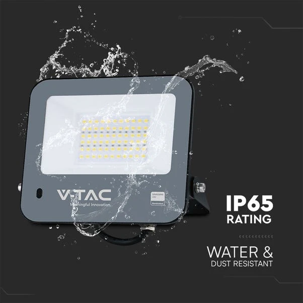 Illuminate your outdoor spaces efficiently with the V-TAC 50W Floodlight, featuring advanced Samsung LEDs and a built-in Dusk to Dawn sensor. This high-quality floodlight offers a lumen output of 120 LM/W and provides bright lighting. The integrated photocell sensor automatically adjusts the light based on ambient natural light: the floodlight turns off when natural light exceeds 70 Lux and activates when it falls below 70 Lux.